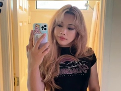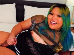 Redhead Asian Shemale with ponytail plays with her trimmed